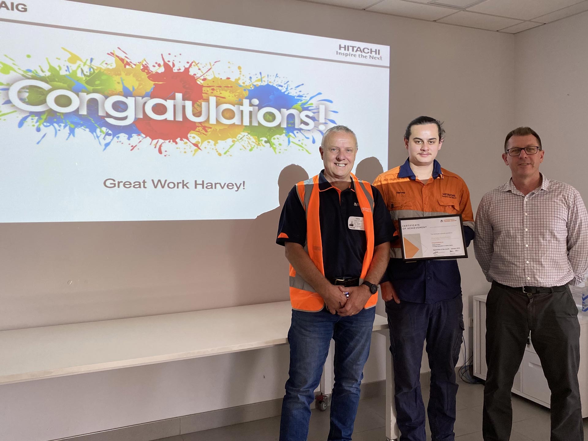 Pictured here, left to right, are Australian Industry Group ATC’s Matt Muller, Harvey and Hitachi’s Customer Service Manager – Victoria, Jacob Chalk.