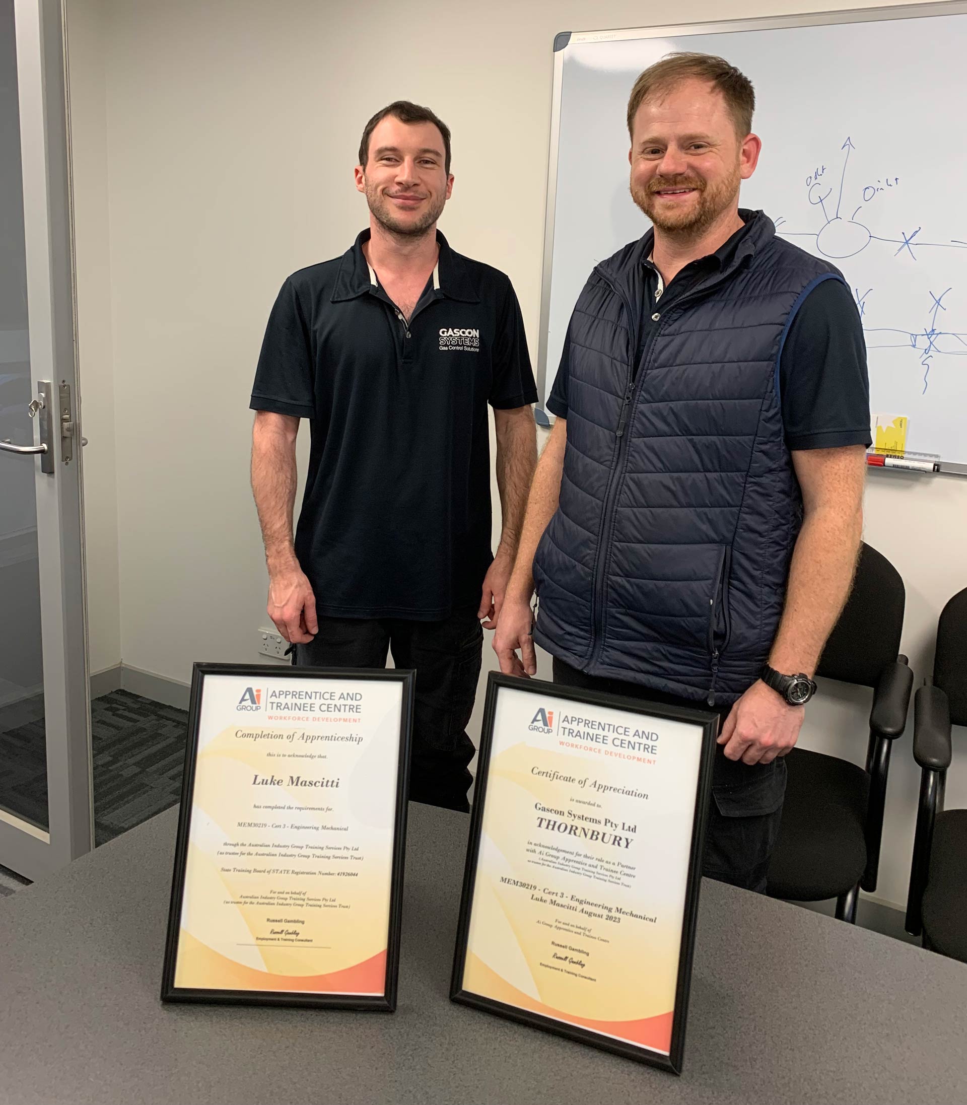 We are thrilled to celebrate the achievement of Luke Mascitti, who has gained his Mechanical Engineering trade papers. This occasion is particularly special because Ben Anderson, Luke’s supervisor at host company Gascon Systems, also completed his apprenticeship at Australian Industry Group Apprentice and Trainee Centre (Australian Industry Group ATC) and received his own trade papers back in 2008. The success of both men is a testament to the growth and mentorship opportunities Australian Industry Group ATC provides.