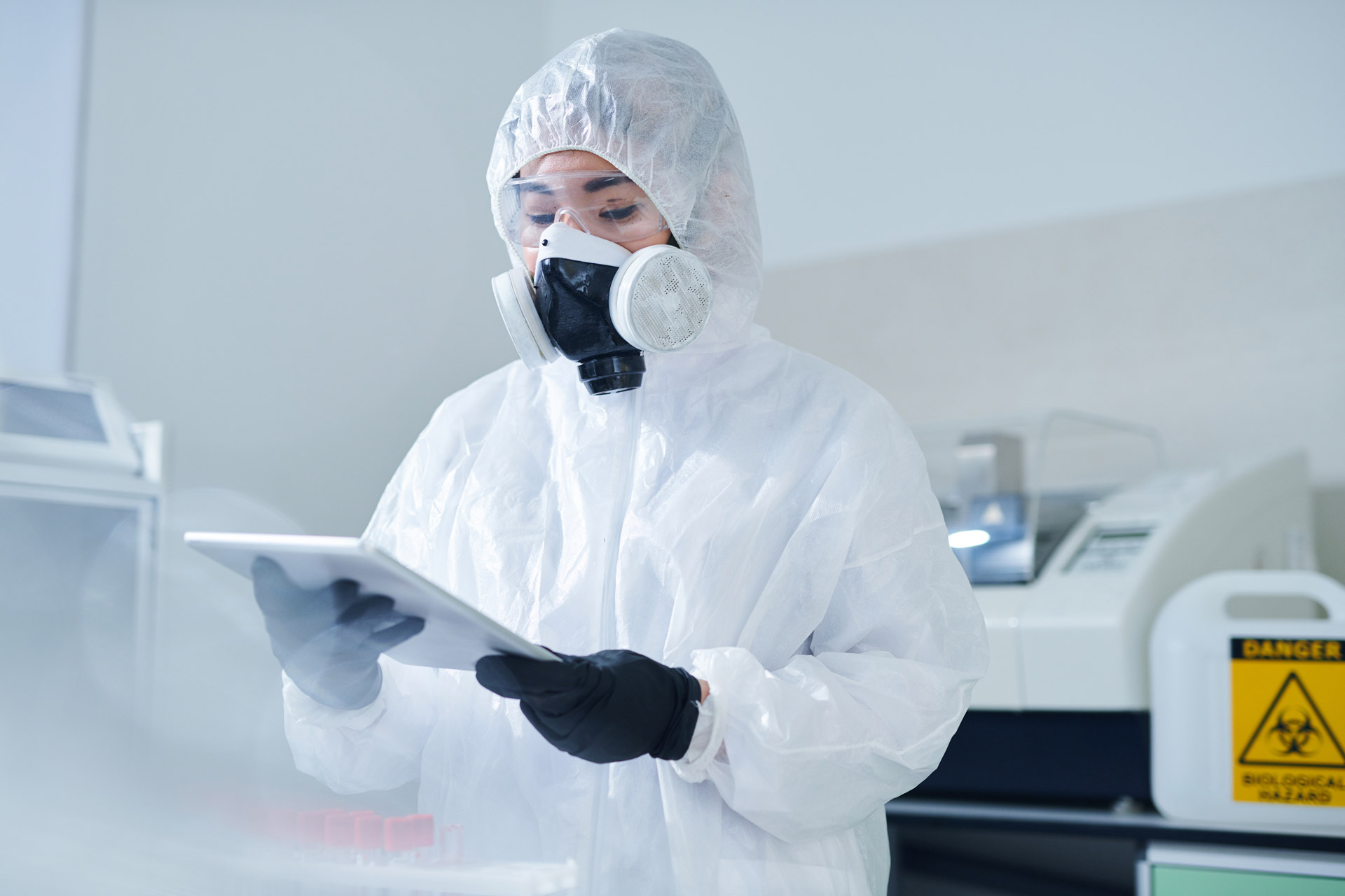 - Be protected. When working with chemicals, always wear the correct PPE as noted in the SDS and Safe Work Procedure. This could include gloves, safety glasses, a face shield, respirator, or PAPR helmet for welding.